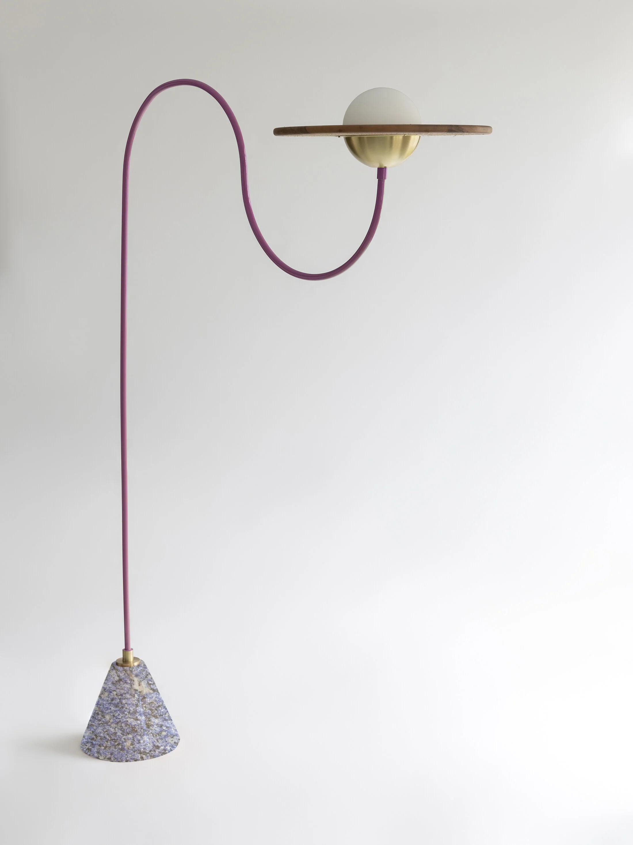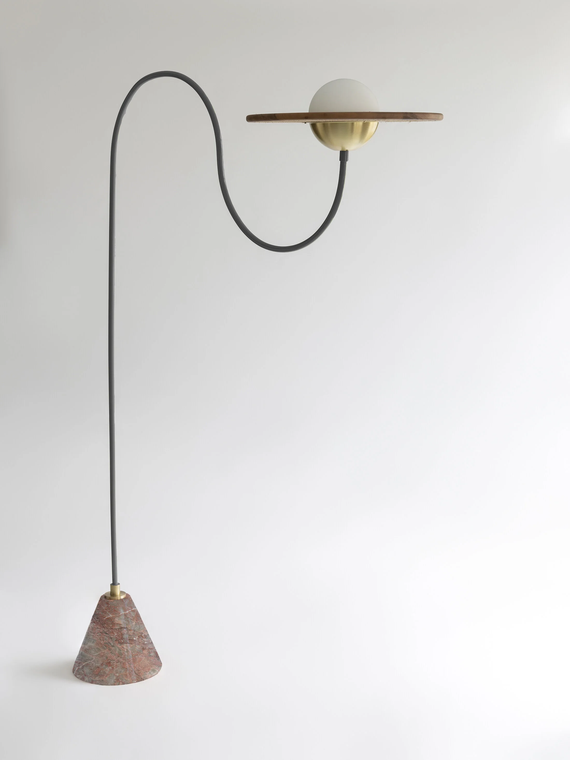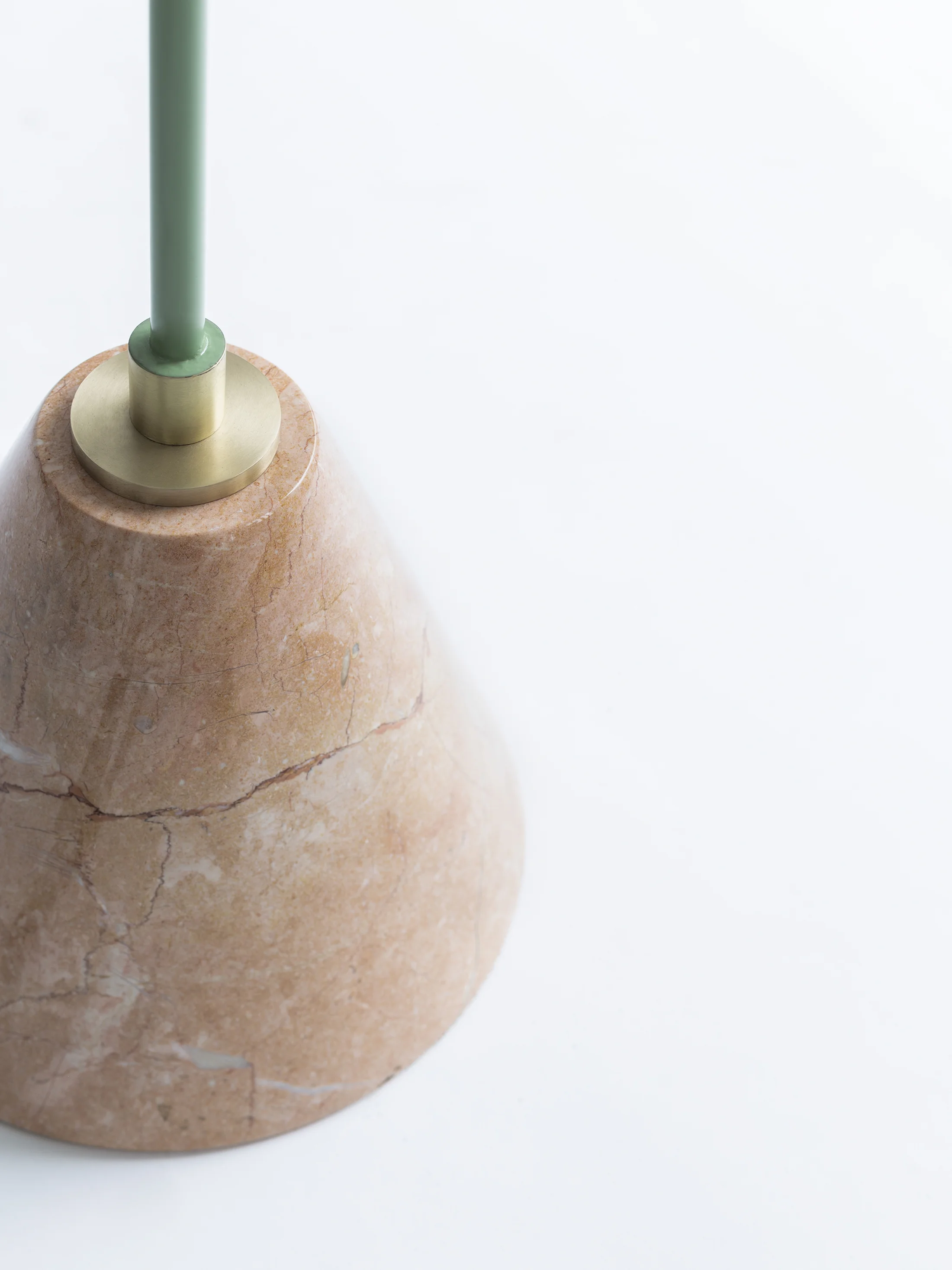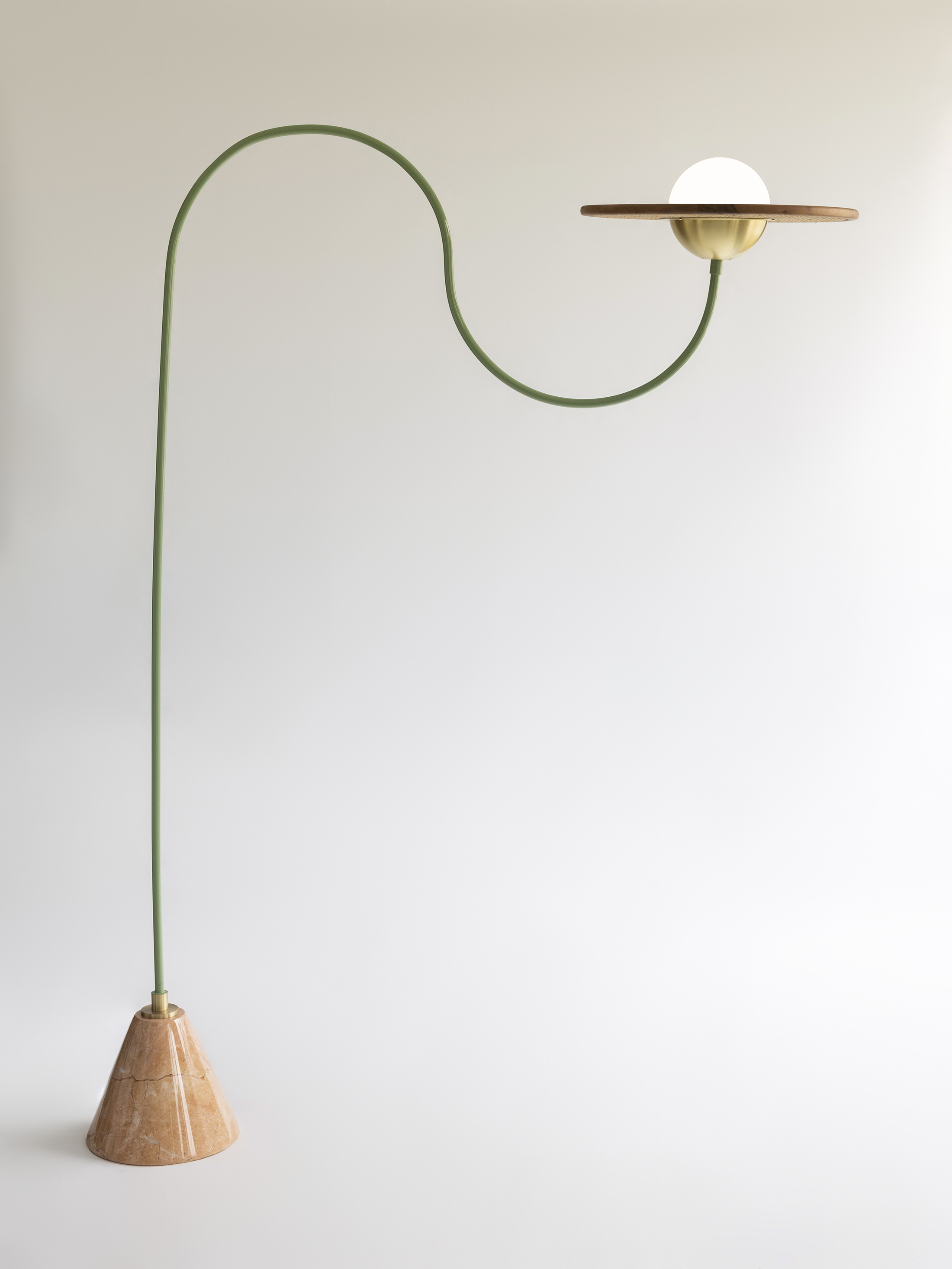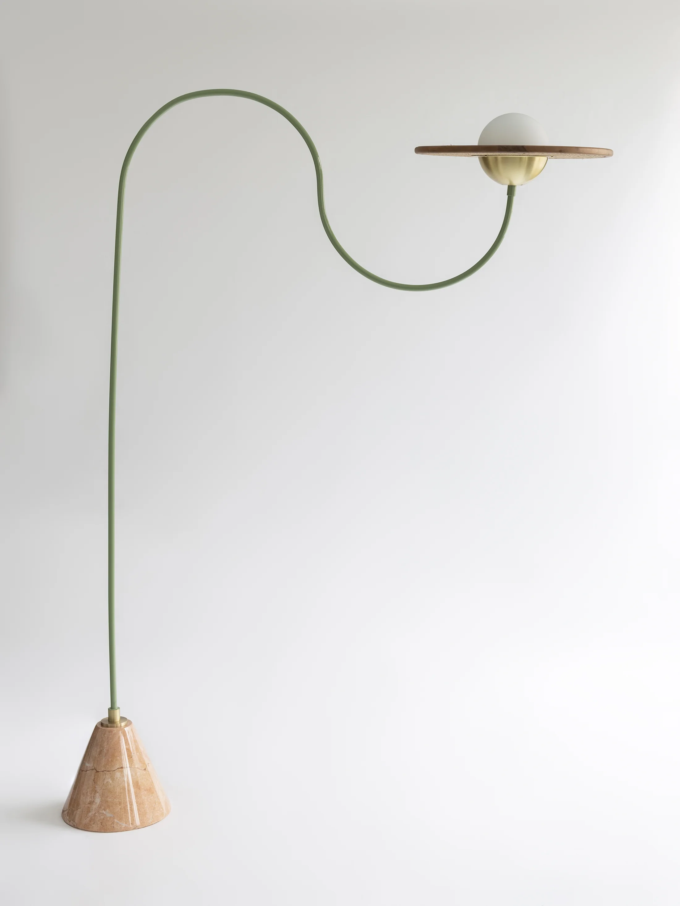 Cassini floor lamps come with beautiful carved marbles at the bottom to support and hold their structure. Rosa Pink marble is used for the mint green and brass version of the Cassini Floor Lamp. It complements the use of natural materials in a contemporary style.