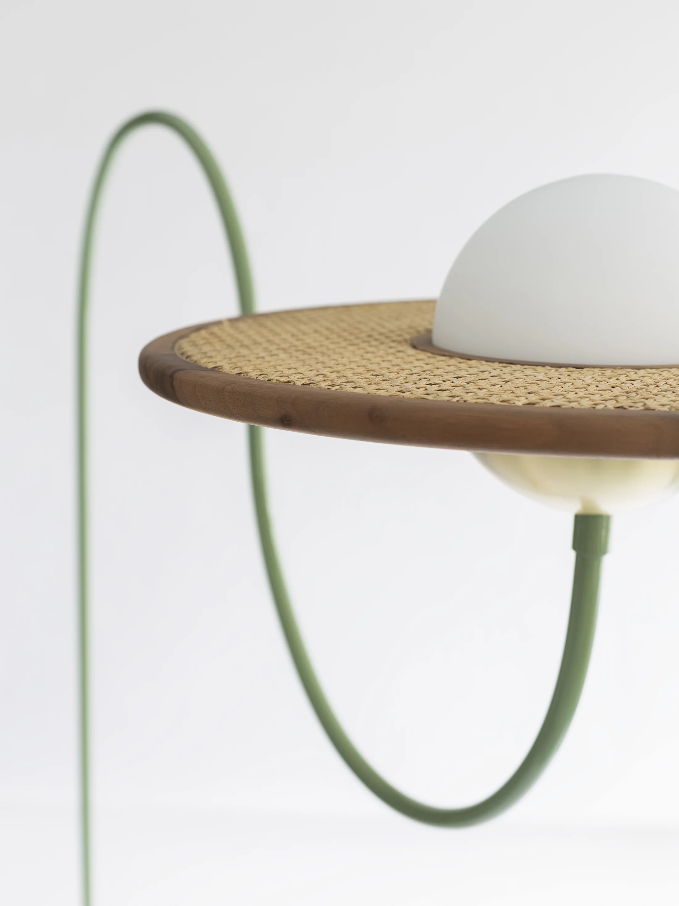 -Rattan, mint green finished metal, frosted glass, brass and rosa pink marble.