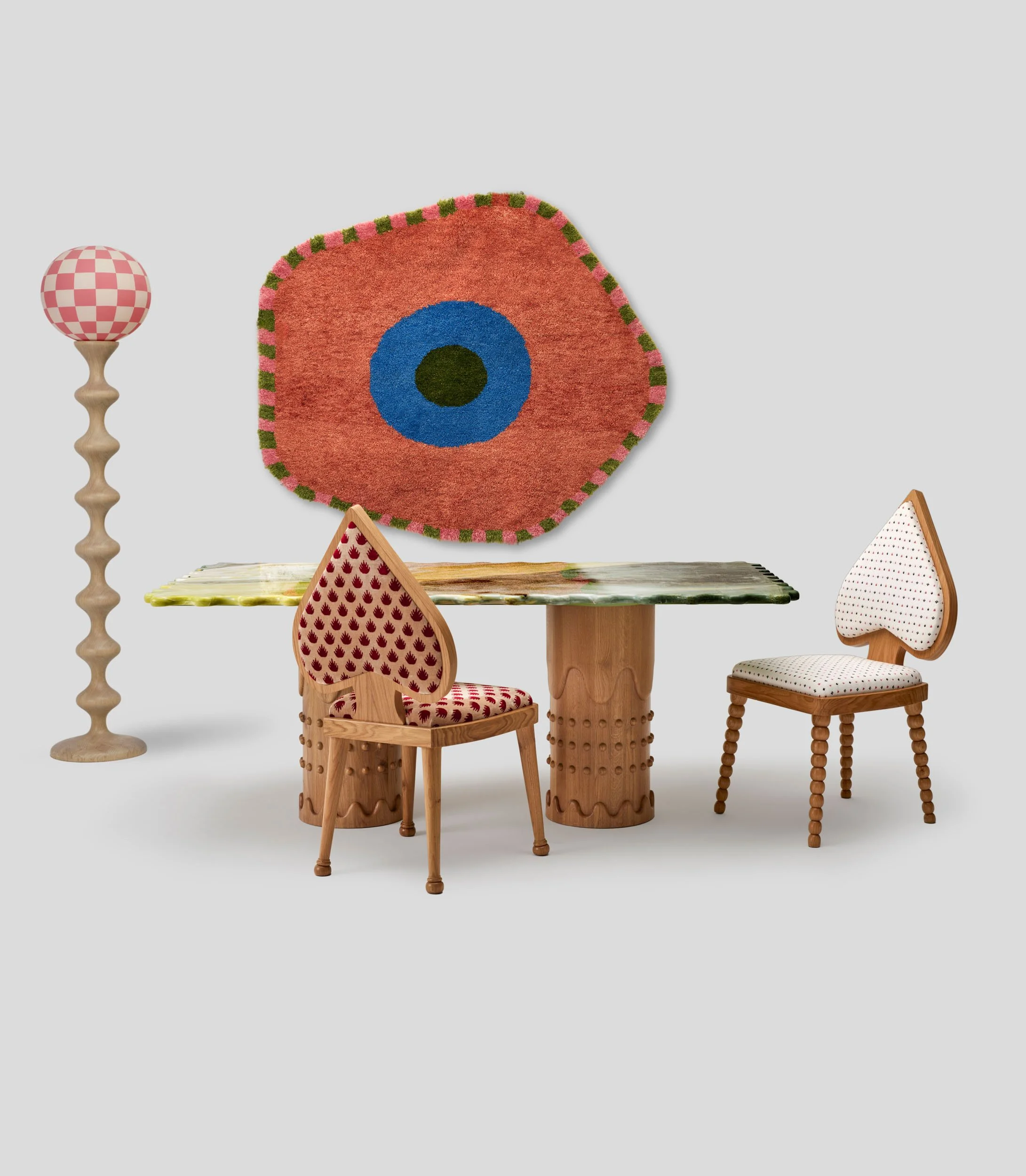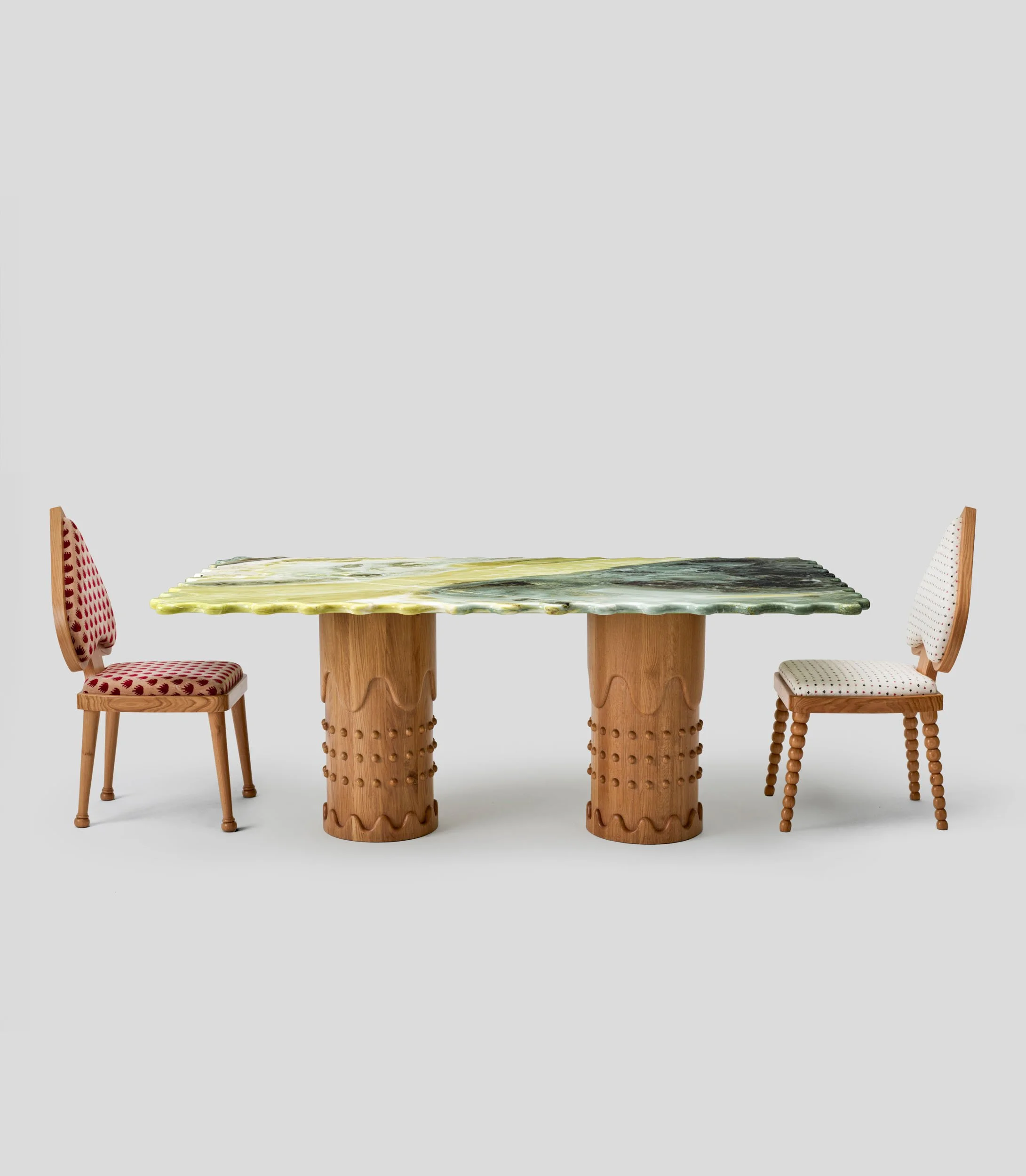 The Metlife Dining Table draws inspiration from the whimsical aesthetic of the “Flintstones” cartoon. It’s striking green onyx marble tabletop is complemented by meticulously handcrafted sculptural oak legs. The chamfered, soft, and wavy edges around the marble provide a more comfortable resting place for hands compared to traditional table designs. Metlife is a distinctive piece that combines joy and elegance, elevating any dining setting. Customization options are available for various sizes and marble finishes upon request.