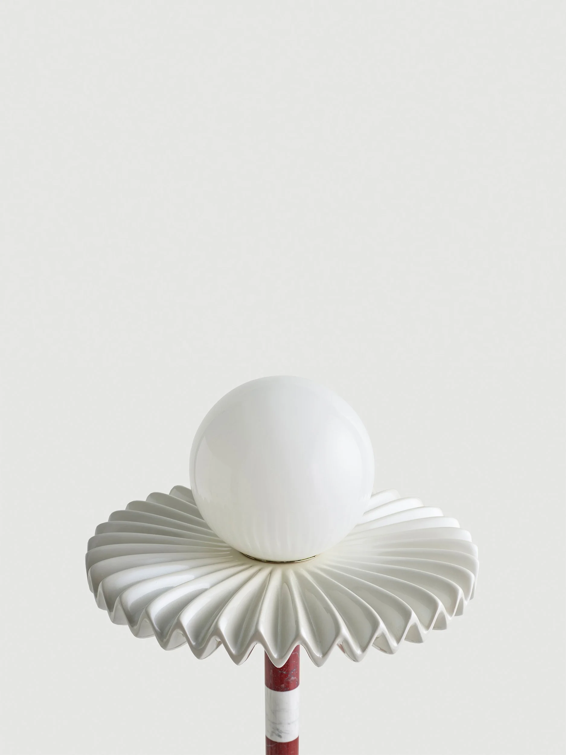 “Sare” is a floor lamp inspired by the 17th Century ruff collar which was a symbol of wealth and status. It also resembles the silent clown “Pierrot” with it’s striped marble body and round glass head. Sare is handcrafted and assembled with different colors of marble stem connecting the top part with the cylindrical marble block base. A pearl colored polyurethane piece connects the body and the milk glass top. The spherical glass head piece comes in a simple milk glass and in a blue and a red hand-painted striped glass. Sare is a reflection of our inner noble clown.